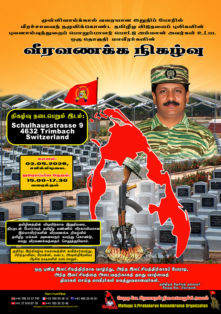 முள்ளிவாய்க்கால் வரையான இறுதிப் போரில் வீரச்சாவைத் தழுவிக் கொண்ட தமிழீழ விடுதலைப் புலிகளின் புலனாய்வுத் துறைப் பொறுப்பாளர் பொட்டு அம்மான் அவர்கள் உட்பட ஒரு தொகுதி மாவீரர்களின் வீரவணக்க நிகழ்வு.
